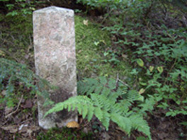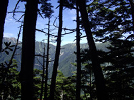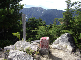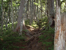 | 8合目の石道標辺りで尾根筋に出たようでやっと急斜面が終わった。 コメツガやシラビソの原生林の尾根道は木の幹が張り出して歩きずらいが、緩やかなアップダウンでやっと気持ちも楽なった。 道が曲がった所で一人の青年と会った。お互い始めて人に会いましたねと言い合ったが、この有明山は登山者が少ないようだ。 この登山道は裏参道コースになっていて、自然の中に一筋の道を付けただけの趣で、霊山として参拝者が訪れる山というがまさにその雰囲気だ。 原生林からとびでるように山頂に到着する。 |