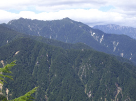 | 中房温泉少し手前にある町営有明山荘駐車場の登山口から、9時スタートする。 刈り取られたばかりのササの中の道15分位で三段の滝方面との分岐を過ぎ、 すぐに幹で作られた階段を登る。登り終わると樹林帯の中の本格的な登りになった。4合目の石の道標辺りから急登になり、 それが延々と続く。木の根が張りだした痩せ尾根は急斜面で、岩場にはロープやクサリが固定されていて、大岩の間の急勾配をひたすら登る。 樹間越しには燕岳から大天井岳の稜線が見えるが登山道は急斜面の連続。 |