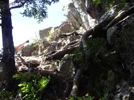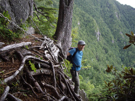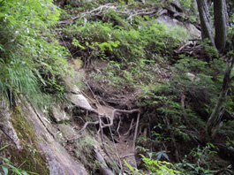 | 木の根を足場に | 急斜面は続く | 樹間から燕岳の稜線が見える |