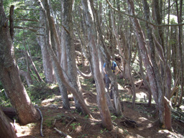 | 樹林帯の登り | 道標は小さく4合目と8合目しかなかった | 足場の悪い急斜面が続く |