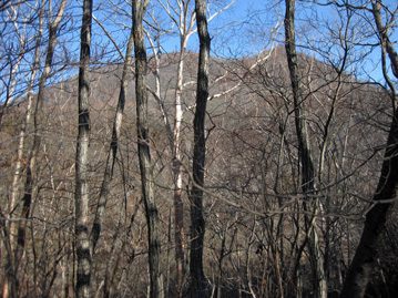 | 二度上峠登山口 | 樹間越しに浅間隠山山頂が見え |