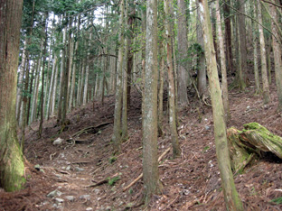 いきなり杉林の急登が始まった。ジグを切るつづら折りの登りは1時間位続き、