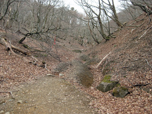 傾斜が緩やかになると杉林から抜け、856b付近の登山道は沢筋に向かっていた。