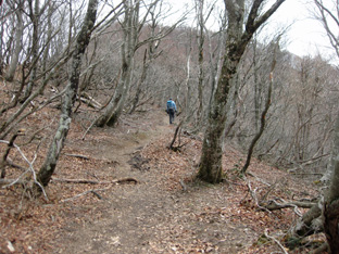 まだ芽吹きもない木々の中の沢道は明るく、沢山積もった落ち葉の道はフカフカだ。