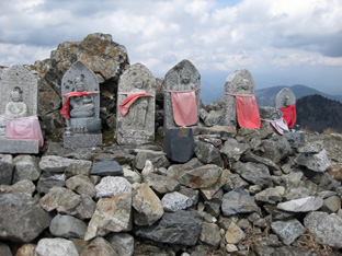 広い山頂は360度の大展望。海のように拡がる琵琶湖、打見山から蓬莱山も目の前で、並んだお地蔵様も涼しげだ。
