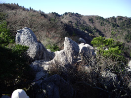 誰もいない広い山頂で15分休み、御在所山へ向かう。 山頂直下の岩場の下りは気を遣う。急な岩場下りが終わると武平峠へ向かう稜線のルンルン下り。先程登ってきた笹の道は標もないので見落としそうだった。所々の花崗岩の深い雨裂の道が長くとても歩きずらい。 木々に覆われた武平峠(880b)に12:15分到着。この下は鈴鹿スカイラインのトンネルでここから展望が開け、御在所山までの一気の登りになる。 花崗岩の砂礫状を登り終えると切り立った岩場で見晴らしが抜群。 御在所山の山頂も間近になり、武平峠の前後には鈴鹿スカイラインの曲がりくねった道が眼下に見える。 今歩いてきた鎌ヶ岳への稜線も手に取るようだ。 |