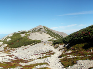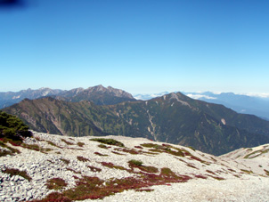 | 小屋でラーメンを注文していると10人位のグループが到着し、これから鉢ノ木岳を往復すると賑やかだ。明日蓮華岳を往復する予定だったが、まだ時間が早いのでこれから蓮華岳を登ろうかと夫と話しをしていると、小屋の主人が明日は天気が良くないので今日登った方が良いとアドバイスしてくれる。峠から右が鉢ノ木岳、左が蓮華岳の登山口。13:00蓮華岳往復にスタートする。すぐ急登で目の前のコブまでは殆ど一直線。針ノ木岳は石がゴロゴロで歩きにくかったのに比べ、歩きやすく、後ろを振り返ると針ノ木岳やスベリ岳そしてその間から劔岳が頭を出しダイナミックな景色。峠の小屋の赤い屋根も小さく見える。 広々としたハイマツ帯に出た。小高いピークを過ぎると、白い岩礫の明るい尾根路でそれは蓮華岳山頂までなだらかに続き、峠から姿が見えなかったやさしい山容の蓮華岳が大きい。山頂近くにコマクサの群落があるが今は花も終わり、赤い色を残したコマクサが僅かにあるだけで茶色く枯れた姿が目に付く。14:05分山頂到着。山頂は、若一王子奥社の祠が祀られている端から二等三角点のある端まで細長く、その中間は七倉山への分岐で白い岩礫の上に縦走路が細く長くに延びている。ゆっくり展望を愉しみ下山。針ノ木小屋には15:15分到着。今日の宿泊者は10人のグループと私達夫婦2人と男性3人のみで、9月下旬平日の小屋は静かだ。男性3人と一緒の部屋で5人で山の地図を前にあの山、この山と山の語らいで楽しい一時を過ごす。翌日6:50分下山。扇沢ターミナル9:30分到着。雨が降る前に下山出来て本当に良かった。 |