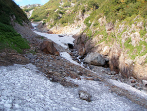 | 扇沢バスターミナルの登山口 | ノド辺りの雪渓 |
