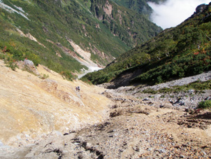 | 針ノ木雪渓は日本三大雪渓の一つといわれているが、9月末になると雪渓歩きも無理なようで、事前に針ノ木岳小屋に確認すると、アイゼン不要で夏道をきてくださいとのことだった。 6:45分 扇沢バスターミナルから車道を渡り、途中4回車道を横切るが針ノ木自然歩道を20分程歩くと、広場に出て、針ノ木登山口に入る。石がゴロゴロの歩きずらい樹林帯の中、湧水の脇を通り、鳴沢を渡り、1時間ぐらいで大沢小屋に着く。樹林に囲まれた大沢小屋はもう閉鎖していて百瀬慎太郎の名文句”山を思えば”が迎えてくれる。ここから扇沢まで3`峠まで4`の案内を見ながら先を進む。 20分位して明るい開けた川原に出た。いつもならここから針ノ木雪渓歩きになるようだが、雪渓はずーと上のノド辺りにしかない。登山道は左岸から右岸へと渡り、沢の斜面を登る。勢いよく流れる雪渓の川を渡り、クサリ場をよじ登る。沢が細くなって雪渓斜面になったが、雪渓は大きく崩れポッカリと口を開けている。その雪渓につけられた心細い斜面を登る。正面には峠の稜線が見えているのでもうすぐと思うが、なかなか峠が近づかない。そして右岸に渡り、砂礫のきつい斜面になった。ジグザグの九十九折りで時間がかかる。汗ダクダクになってやっと針ノ木峠に着く。10:14分到着。 |