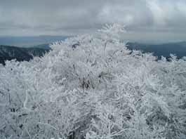 | 中岳山頂の英彦山神社中宮 | 北岳山頂 | 山頂付近の霧氷 |