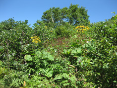 | 別荘地を抜けると南登山口に着いた。 鳥居前の広場に車を止めて靴をはいていると一台の車がきて、 その人はこの山を何回も登っていると云う。 クマがいるかもというので鈴を付けて9時石の鳥居をくぐったが、鈴の音がうるさくすぐしまってしまった。 林道を横切り、樹林帯の中を登って行く。30分位で第1不動明王に出会った。 飯縄山は昔から山岳信仰の霊場として登られてきたそうで、 登山道に続く13仏の石像の第1はこの不動明王から始まり、 第13の菩薩像を過ぎると林から抜け出て、展望が広がった。それまで殆ど直登で、 ただひたすらに汗流しての登りだったが傾斜もゆるくなって、 お花畑が広がった。シャジンやトウゲフキがたくさん咲いていて、みんな背が高いのには驚いた。 |