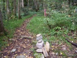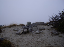 | 山頂にはバスで来た9名のグループと一組のご夫婦が狭い山頂に座っていて、お疲れさんと声をかけてくれる。深い霧の中では展望もなく、10分程でグループとご夫婦は下りていった。一人の男性が到着し、夫と私も20分位休憩して往路を下る。今日の登山者は私達を入れて4組だけのようだ。2100b地点位で雨になり、樹の根が張った急斜面はとても滑る。登山口16:11分に到着。朝は気が付かなかったが、登山口の側には立派な立山杉が2本あり、とても神々しかった。1200b地点位から雨もあがり、登山口では薄日も差してきたが、風もなく、暖かで穏やかな日よりの久し振りの長丁場登山だった。万歩計は35626歩。 |
