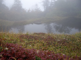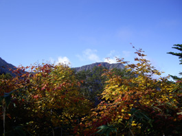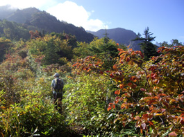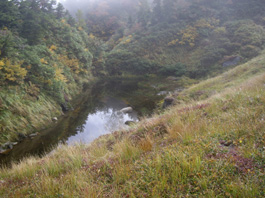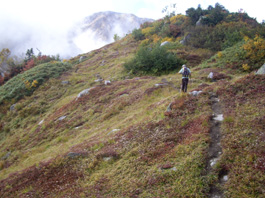 | 小さな地糖の脇を通り、左に大きな地糖の様子を霧の中で透かして見たりしながら急な草原を上る。すーっとガスが流れ、一瞬目の前に山が現れた。毛勝山だ! でも又すぐに濃霧になりオオシラビソの樹林帯になって、又、草付き斜面になった。標高2151b地点を過ぎ、大きな地糖の脇を通って、急斜面に出た。人の声が聞こえ、30b位先に何人かが登っている様子なので休憩。振り返ると見事に紅葉した斜面が濃霧の中でも明るく見えている。最後の急斜面に立ち向かう。胸突き八丁の岩混じりの草付き急斜面を200b余り登り切ると広い草原に出た。そしてすぐ上に突き上がった所があり山頂標識が見え、5時間40分かかって11:20分毛勝山山頂に到着。 |