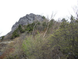 | 雲がかかった乾徳山を見ながら | 岩峰の山頂を仰ぎ見ながら |