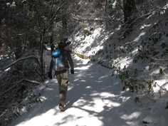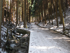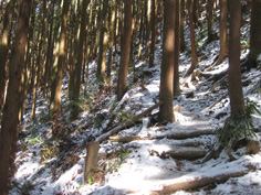 | 水越峠からぐるりと回って金剛登山口あたりに着いたが駐車場がない。 道路脇の駐車場は満杯。 駐車場を探してどんどん上に上がり、とうとうロープウエー近くの府営駐車場にきてしまった。 千早城を経て山頂に至る正面登山道を登りたいと思って来たが、その登山道までは今きた車道を2`あまり歩かなくてはならなくなった。 そこに向かおうとした時、府営駐車場の横の登山道から丁度大勢の登山者が下りてきた。 正面登山道をやめてここから登ることにした。アイゼンはかないと無理だよという声を背にまずは伏見峠へと向かう。 7〜8分歩くと杉林の中から人が出てきた。雪の中に細い道がある。尾根への直登のようでそこを登ることにした。 |