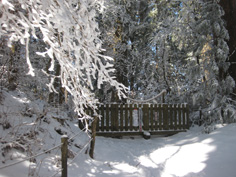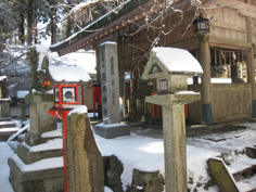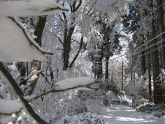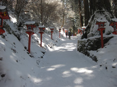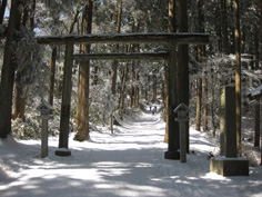 | 杉林の中のカチンカチンに凍った急登を40分余り汗かき登ると尾根道に出た。 やっと歩きやすくなって5分程で境内になった。 両側が赤い灯籠で飾られた雪の参拝道はとてもきれいだ。 このまま進むと国見城跡の広場にゆくことになり、金剛山の山頂標識もあるようだが最高点より50m程低いので、 右手に折れ、夫婦杉を見ながら葛木神社に到着。 参拝して神社の裏手にある葛木山山頂へと回ると、 神域につき立ち入り禁止の立て札で雪の中に堅く戸閉ざされていた。又、葛木神社に戻り、正面の金剛山山頂1125bと書かれた石柱を写真に納める。 真っ青な空に気づき空を仰ぐと霧氷がきれいでびっくりした。神社の桜の木、そして杉の巨木、自然林が宝石のように輝く中を一の鳥居までゆっくりと進む。 |