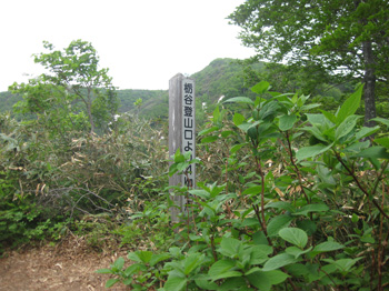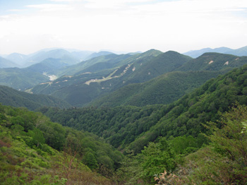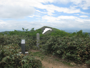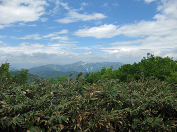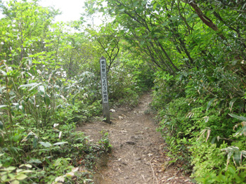 登山口から1キロ毎に標識があり、杉林からブナの原生林に変わった1340bのピークからは展望が開け、金剛堂山の山頂が見えてきた。