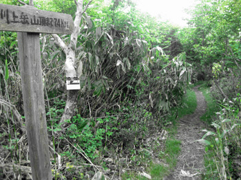 モンデウススキー場からの道と合流してドウダンツツジの中を進むと広場に出た。 ガスがかかってきて今日は生憎と天気が悪く何も見えない。 2〜3分進んで三角点のある位山山頂に着いたが、登山道上のような山頂で狭く、展望も全くない。 すぐに広場に戻って休憩したが霧雨も降ってきたので縦走は止めた。 巨岩群を眺めながらのんびり下ったが、巨岩群や特に天の岩戸の前にでると霊気を感じ、ここは信仰の山のようだ。一組のご夫婦と登山口近くでお会いし、登山口8:30着。 |