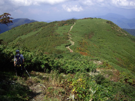 | 歩きやすい登山道は最初だけで、すぐに木の根の階段状を登ったり、ゴロゴロ石や岩の登りの急斜面になる。でも展望が素晴らしく、背景にはいつものびやかな山並みが広がっている。今日はとても良い天気で、暖かく、半袖になっても汗が吹き出てくるが、気持ちの良い登り50分位で道は緩やかになってきた。刈り払われた笹の中の道がズーと続き、いくつかのなだらかな隆起を乗り越え丸い山容の山頂が見えてきた。12:40分能郷白山山頂に到着。山頂は一等三角点と標識だけで 笹に邪魔されて展望もないが、すぐ向こうに白山神社の奥の院が見える。少し下がった尾根上から素晴らしい展望が広がり、切り落ちた北西斜面の下には林道も見える。登るときに下山する3組の登山者とすれちがい、山頂は独り占めよと云われていたので、のんびり尾根道に座って20分程休み、往路を下る。登山口14:10分着。 |