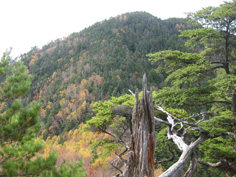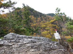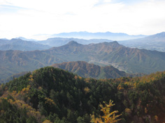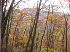 カラマツ林を20分あまり登ると尾根上に出て、カエデやナラの木の間越しに御座山が見え、それはまだはるか遠い。 紅葉も残っていて、美しい落葉樹林を落ち葉をふみしめながら30分位登ると、今度はシャクナゲ林になった。 そして見晴らし台に出た。林の中の露岩上で一服し、又、シャクナゲ林に入る。シャクナゲの花の頃はどんなに素晴らしいことかと華やかな登山道を想像する。 10:16分前衛峰に到着。ここは1992b、山頂まで35分と書かれた標識があった。 |