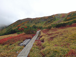 やがて木道になった。 紅葉が素晴らしく、低く垂れ込めた雲が行くてを遮ってかえって趣ある山道になっていた。