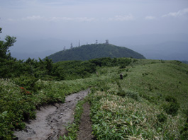 | 展望がないので、お水を飲んだだけで女三瓶山に向かう。 歩き出すとすぐ濃霧が去り、山小屋が見え展望が少し広がった。 左に山小屋を見送り、男三瓶山からどんどん下って、女三瓶山の登りになる。たくさんの電波塔に占領された女三瓶山山頂に1時間位かかって11:45分に着いた。 天気が良くなってこれからぐるーと歩く孫三瓶山や子三瓶山が目の前に見える。 女三瓶山から下るとリフト乗り場があって、リフトからきた5人のグループとすれ違った。 リフト乗り場分岐から少し登って大平山山頂に到着する。 |