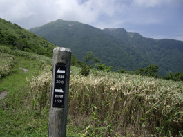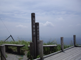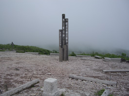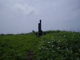 | 定めの松駐車場から西の原コースで9:04分出発する。 正面に男三瓶山と子三瓶山を見みながら草原を進む。三瓶山は”出雲国風土記”ゆかりの名峰で火口原を中心に三瓶一家が連なっていて魅力的な山と書いてあったので、楽しみにスタートする。 まず最高峰の男三瓶山から女三瓶山、太平山そして孫三瓶山、子三瓶山と三瓶山一家を時計回りに訪ねることにした。 樹林帯の登山道からガレのツツジが咲く灌木帯になり、草原帯の登山道に入って1時間45分で男三瓶山山頂に到着。 今まで良い天気だったのが山頂直下になった頃からガスがかかり始め、山頂に着いたとたん濃霧になってしまった。 |