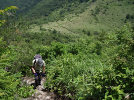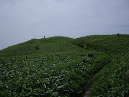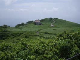 そして子三瓶山の登りになって山頂13:31分到着。 草原帯の子三瓶山山頂からの眺めも堪能し、笹原の広がる尾根から赤雁山の頂上部を巻いて道標から谷間を下る。小屋の横を通り、 登山口14:34分到着する。そして10分程牧場の草原歩きで定めの松駐車場に着いた。 こんな素晴らしい三瓶山なのに、リフトから来た観光客以外に登山者に会わなかったので、下山後宿で聞いたらこちらでは暑い時には登山はしないと言われた。 本当に今日は暑く、汗ダラダラだったが、気持ちの良い山に登れて満足だった。 |