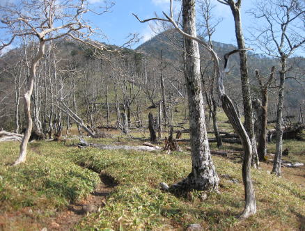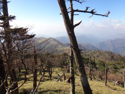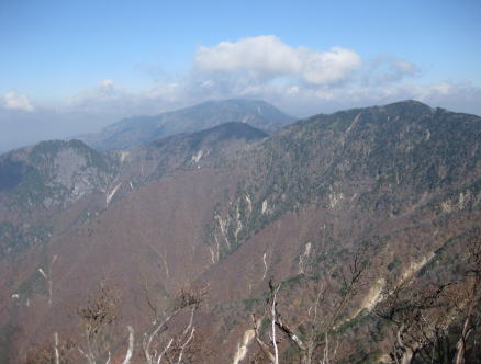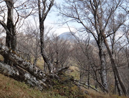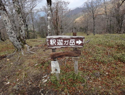 すぐに樹林帯の登りになったが葉の落ちた木々越しに釈迦ガ岳が見え始めた。