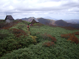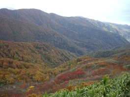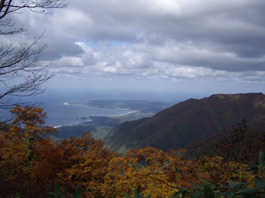 山頂からの眺めは広大で、岩木山や八甲田連峰の展望や、 白神の山々がうねりのようでちょうど強風にあおられている笹のうねりと 一緒に動いているみたいだ。日本海が大きく手にとるように見えるのには驚いた。 風が強くカッパを着込んで20分程休んでいたが、 大勢のグループが到着したので下りることにした。 日曜日の紅葉の真っ直中、たくさんの登山者と行き交い、 素晴らしい紅葉のブナの林で遊びながら下山した。登山口13:39分到着。 |
