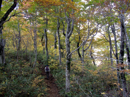 小沢を横切り、つずら折れの急登となる。 稜線へと登り切るとマテ山分岐に着いた。 樹林帯の中に看板だけが木にかかっていて、左に少し歩いただけでマテ山山頂。 三角点があるのみで展望もなくすぐ戻ると尾根道はブナ林になった。 素晴らしい紅葉で、ブナ林の中にカメラマンが何人もいる。 黄金色のブナの葉がおおいかぶさり空気まで色づいているような気配だ。ブナからタケカンバ林になると尾根道は急になりぐんぐん登る。 |