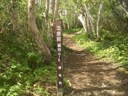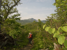 | 登山口から4合目位までは背の高い根曲がり竹の間に作られた道を登る。 タケノコ取りの人達も大勢来るので、標識がある幅広い緩やかな道が続く。 両脇に大きく立派なタケノコがあちこち顔を出しているのを眺め、 ダケカンバとミズナラが多くなってきた登山道を高度を上げていく。 5合目を過ぎ傾斜がきつくなって森林限界になった。 ササ原が広がる向こうのコブに7合目の標識が見え、雪の斜面になってくる。 7合目を過ぎると視界が一気に開け、素晴らしいお花畑の中の登りになった。 |