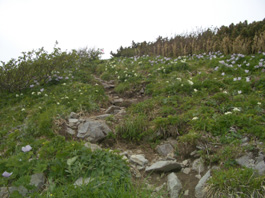 | 3合目 | 7合目 | 7合目の雪渓を渡るとお花畑が続く |