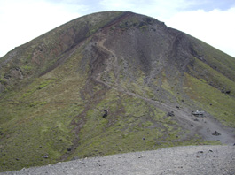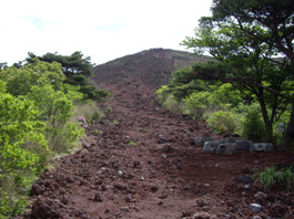 | 突然樹林帯から抜け出て火山礫の登り | ミヤマキリシマ | お鉢の火口の上に高千穂峰が顔を出す |