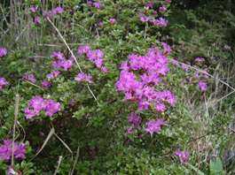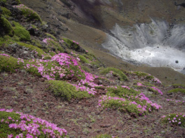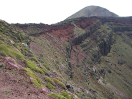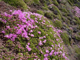 | 高千穂河原の登山口から往復した。登山口から樹林帯の中に石畳を敷き詰めた道が続く。 丁度ツツジの頃で、両脇には赤やピンクや白の花が咲き、ミヤマキリシマが咲いているのを見て感激する。石畳の道はゴロゴロ石の道になって突然 樹林帯が終わって、赤ガレの火山礫の登りになった。ガレの急斜面は足がずって歩きずらい が、ミヤマキリシマは火山礫と軽石の足場の悪い道の両脇にも咲いている。 眺めながら登っていくとお鉢の中が見える所に立った。 ミヤマキリシマはお鉢の中の急斜面にも沢山咲いていて本当に見事だ。お鉢の火口の上には高千穂峰の山頂も顔を出していた。 |