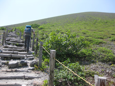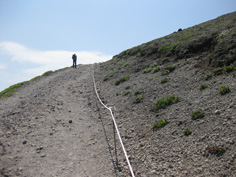 登山道は階段状になり、両脇にはロープが張られ、噴火口めがけて登った砂礫斜面は緩やかに蛇行した道になっていた。