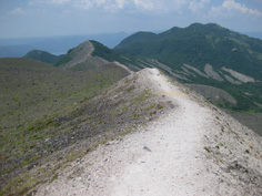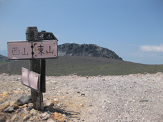 マルバシモツケやタルマエソウ(イワブクロ)やウコンウツギ等が咲き、外輪山の縁に着くと左に西山、右に東山と立派な標識が立っていて、