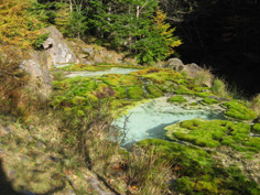| ここも大勢の登山者が休憩していた。お弁当など広げて、みんなゆっくりとしている。 おやつを食べ、15分休んで、唐沢鉱泉に下りる。 沢筋の巨岩が連なる道は、いたるところ水で溢れ、苔むした岩は滑りやすく、登ってくる登山者とすれ違うのも難儀な道だ。 1時間位でやっと巨岩から離れ、樹林帯に入り緩やかに40分程下って唐沢温泉登山口に着いた。2〜3分すると唐沢温泉源泉が現れた。 それはまるで小さな九寨溝のようで、ぬるめの源泉にはびっしりと湯の花がつき、緑のコケにかこまれてとても神秘的な源泉だ。 唐沢温泉14:30分到着。西尾根コース登山口とは5分位離れていた。 |