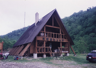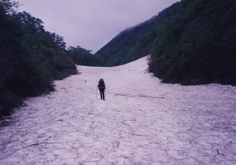 | 士別市の天塩岳ヒュッテから、登りは旧道コース、下りを新道コースで行くことにした。5時、ヒュッテからすぐに川を渡る。ガマ沢に沿った道を進んで天塩岳新道コースの分岐を右に見て直進。 今度は前天塩岳コースとの分岐に出て又、直進。沢に沿った道は踏み跡のようになってきた。右岸、左岸と渡り歩き、高巻きやへつりを進み、沢幅が狭くなって雪渓にぶっかった。 |