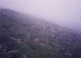 | 見事なエゾノリュウキンカの群落があちこちにあり、ここは天塩川の源流で水量が多く、ごうごうと音を立てて勢いよく流れて恐ろしい程だ。雪渓によじ登ると細くなった沢は雪の下になり、ラクダ岩が見えてきた。ラクダ岩を左に見ながら長い雪渓を登っていく。前方からだんだんガスが立ち始め、あっという間に濃霧になってしまった。長く急な雪渓歩きが終わり、頂上直下のハイマツ帯を登り切って天塩岳山頂に到着。濃霧の山頂には山頂標識があるだけだ。 |