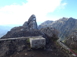 風があったら吹き飛ばされるところだ。そして岩尾根を登り切って八方睨の頂に到着。 八方睨の頂は広く、素晴らしい展望だ。八方睨ナイフリッジを見下ろし、高妻山の山容を眺めながら、高妻山に登った時の最後の1時間の急登を思い出した。 方位盤で山座同定し、一不動方向へと向かう。10分位で戸隠山山頂に着いた。ここからも高妻山が大きい。 |