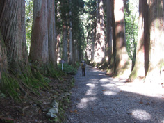 | 戸隠奥社入り口から大鳥居をくぐり、 奥社へと続く杉林参道をまっすぐ進む。 随神門をくぐると、大木の古杉並木が続き長い歴史が偲ばれる。やがて石階段になり奥社に着く。社務所の横の登山口まで丁度30分かかった。
