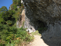 登山口には八方睨コース核心部の図があり、3人の登山者が案内図を眺めていた。9:08分登山口に入る。岩根の急な登りで尾根に出る。 木間越しから戸隠山の岩稜や岩壁が見える。岩壁の下を長く掘ったような登山道に出て百間長屋と書かれた岩の奥には石仏様が祀られていた。 左に回り込み、尾根への登りになり、岩場が現れクサリ場がはじまった。 岩の足場を見つけられたので長いクサリ場も問題なく、斜度70度という胸突岩を登り終えると蟻ノ戸渡りに出た。 |