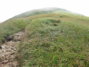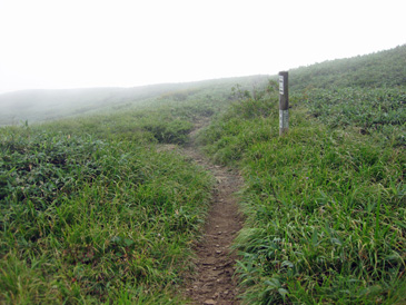 笹が終わって霧の中から山頂が見えた。