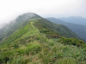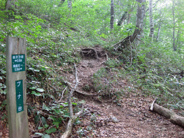和賀岳から下る時2人の登山者に会った。霧が少し晴れ、遠く奥羽山系の山々をわずかに見ることが出来、又、ブナの森を楽しみながら甘露水登山口に下った。 |