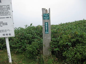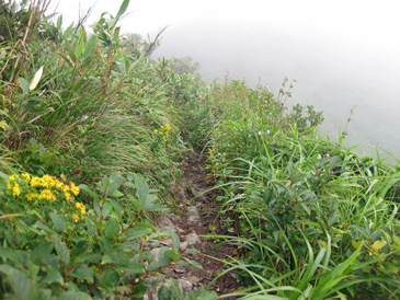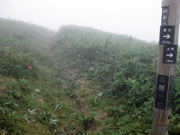 濃霧で展望がないが快適な登りで藥師平を通過し、8:50分薬師岳山頂に到着。 狭い山頂で少し休み、すぐ下にある薬師堂の前から藥師平に向かう。