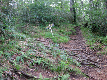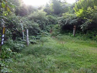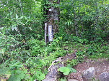 4合目、5合目と標識が出て、明るい登山道は歩きやすく、沢を渡り、この源流の水を村に引こうとした開拓者の名前がついた6合目与治兵衛に着いた。