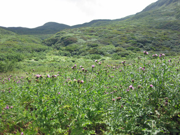 鮮やかな青のトリカブトの花やアザミの群生、フウロやナデシコ等も咲いていて9合目への緩やかな登りは本当に楽しい。