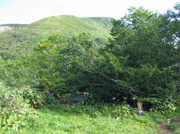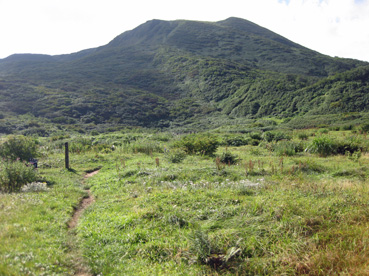 少し急な斜面を進むと湿原地に出て7合目。左手には三界山がのびやかに広がっている。