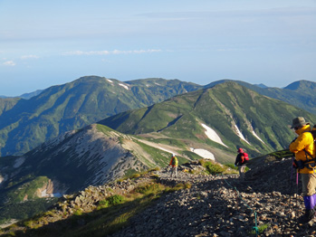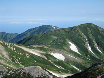 | 朝日岳山頂でのんびりしてから朝日小屋に下りることにした。白馬岳の稜線を眺めながらの楽しい下り。